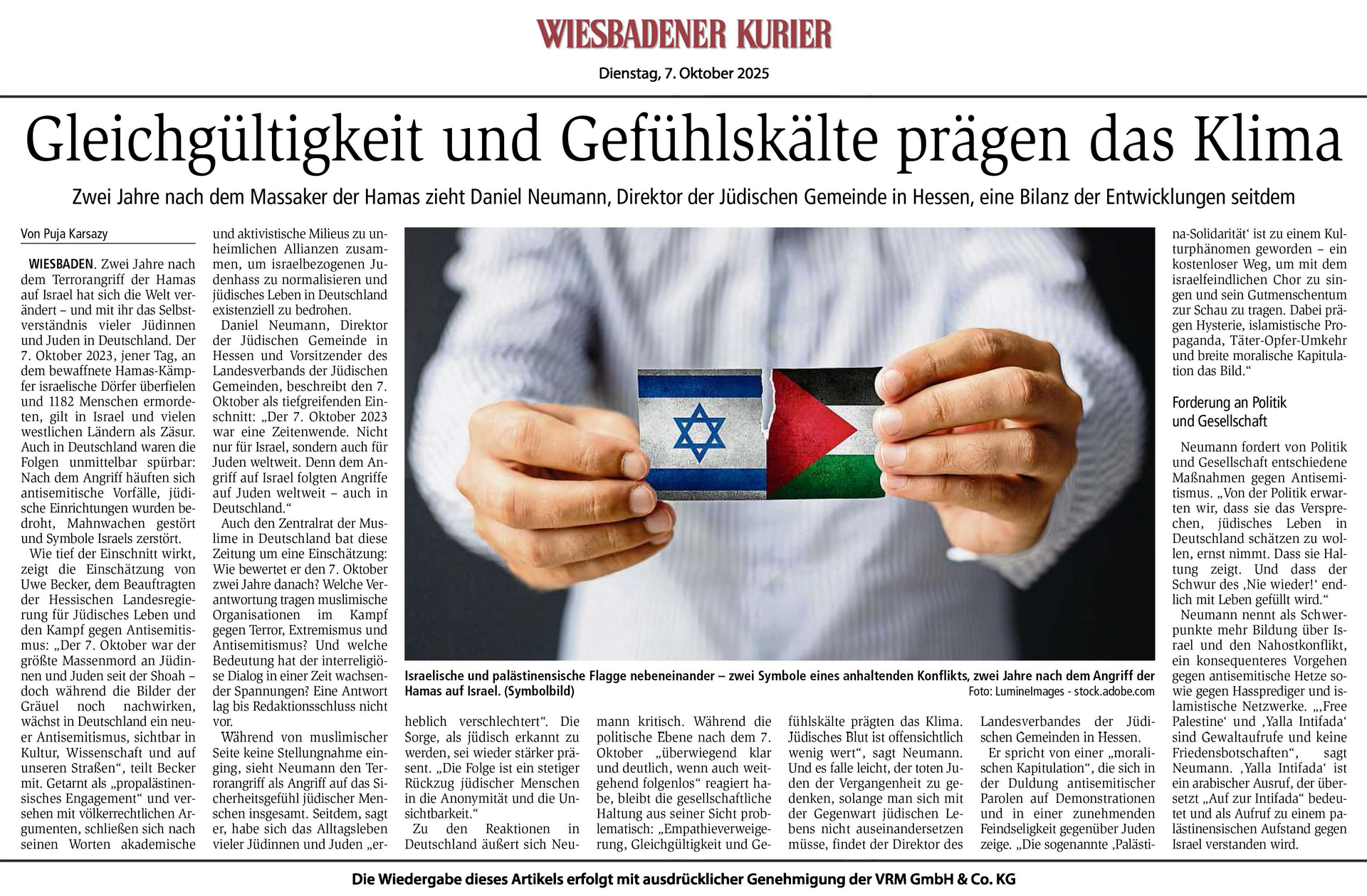 Zwei Jahre nach dem Terrorangriff der Hamas auf Israel hat sich die Welt verändert - und mit ihr das Selbstverständnis vieler Jüdinnen und Juden in Deutschland. Der 7. Oktober 2023, jener Tag, an dem bewaffnete Hamas-Kämpfer israelische Dörfer überfielen und 1182 Menschen ermordeten, gilt in Israel und vielen westlichen Ländern als Zäsur. Auch in Deutschland waren die Folgen unmittelbar spürbar: Nach dem Angriff häuften sich antisemitische Vorfälle, jüdische Einrichtungen wurden bedroht, Mahnwachen gestört und Symbole Israels zerstört.